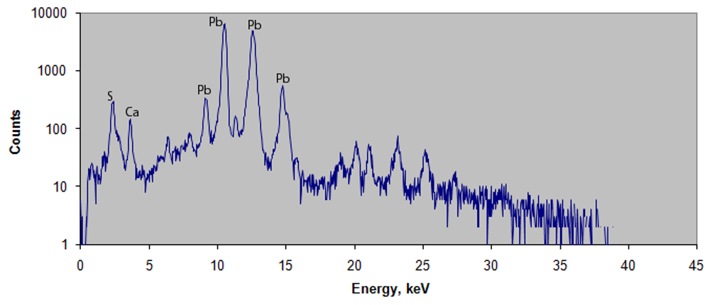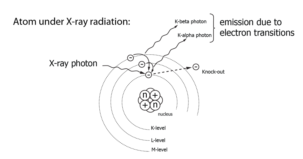 The techniques referred to as X-ray fluorescence spectroscopy (or simply XRF) utilizes X-ray radiation in order to excite atoms and make them emit specific wavelengths. After the atom is excited, the electrons start recombining inside it, which leads to emission of a number of photons. The wavelengths of these photons contain the information on the chemical element. Thus, by gathering up all the photons from the material irradiated one can decide on which elements are present, and in what quantities.