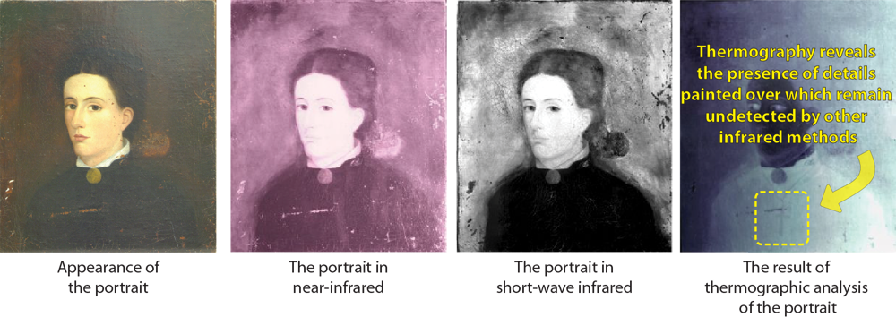 Thermography is extremely useful when it is necessary to detect the presence of subsurface detachment defects. These can be hardly (or not at all) detectable by infrared vision because of the depth of structural defects. On the other hand, X-ray radiography may also be of little use because of the extremely small thickness of detachments. For example, in the figure below one can see the result of inspection of an unattributed portrait. The coat of the person in the picture is painted with some kind of carbon-containing pigment like ivory black, which makes it opaque to infrared. Revealing the necklace in this case was possible by the means of thermographic analysis only.