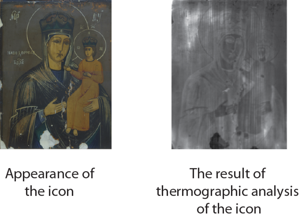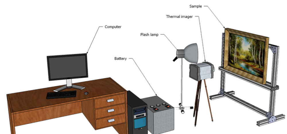 During the analysis the piece of art is stimulated with a short light flash which slightly (several degrees) increases its temperature. The surface temperature is recorded by a thermal camera as a series of snapshots. These snapshots are mathematically processed then in order to extract necessary information. These raw thermographic data undergo mathematical processing and final result image is extracted.