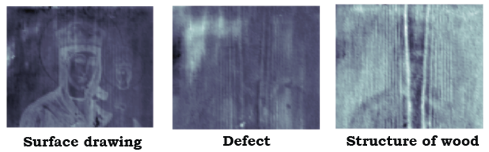 Advanced algorithms applied to raw thermographic data collected from the works of art analyzed allow for separation of patterns which correspond to different structural features such as the surface drawing, defect(s) and the structure of the support.