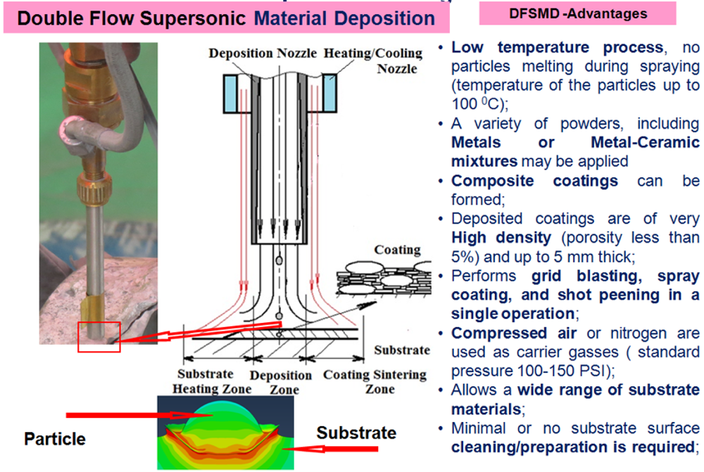 True Image Solution (TIS) Co, UK, TESSONICS Inc. and Institute for Diagnostic Imaging Research (IDIR), Canada constantly review the development of new non-invasive art work analysis methods and subsequent restoration by advanced deposition and patination methods. The new Double Flow Supersonic Material Deposition (DFSMD) method developed by TESSONICS and IDIR ensures precise local restoration of damaged areas at near ambient temperature due to dual flow of propellant and cooling gas. The principle and advantages of DFSMD are shown on Fig.1