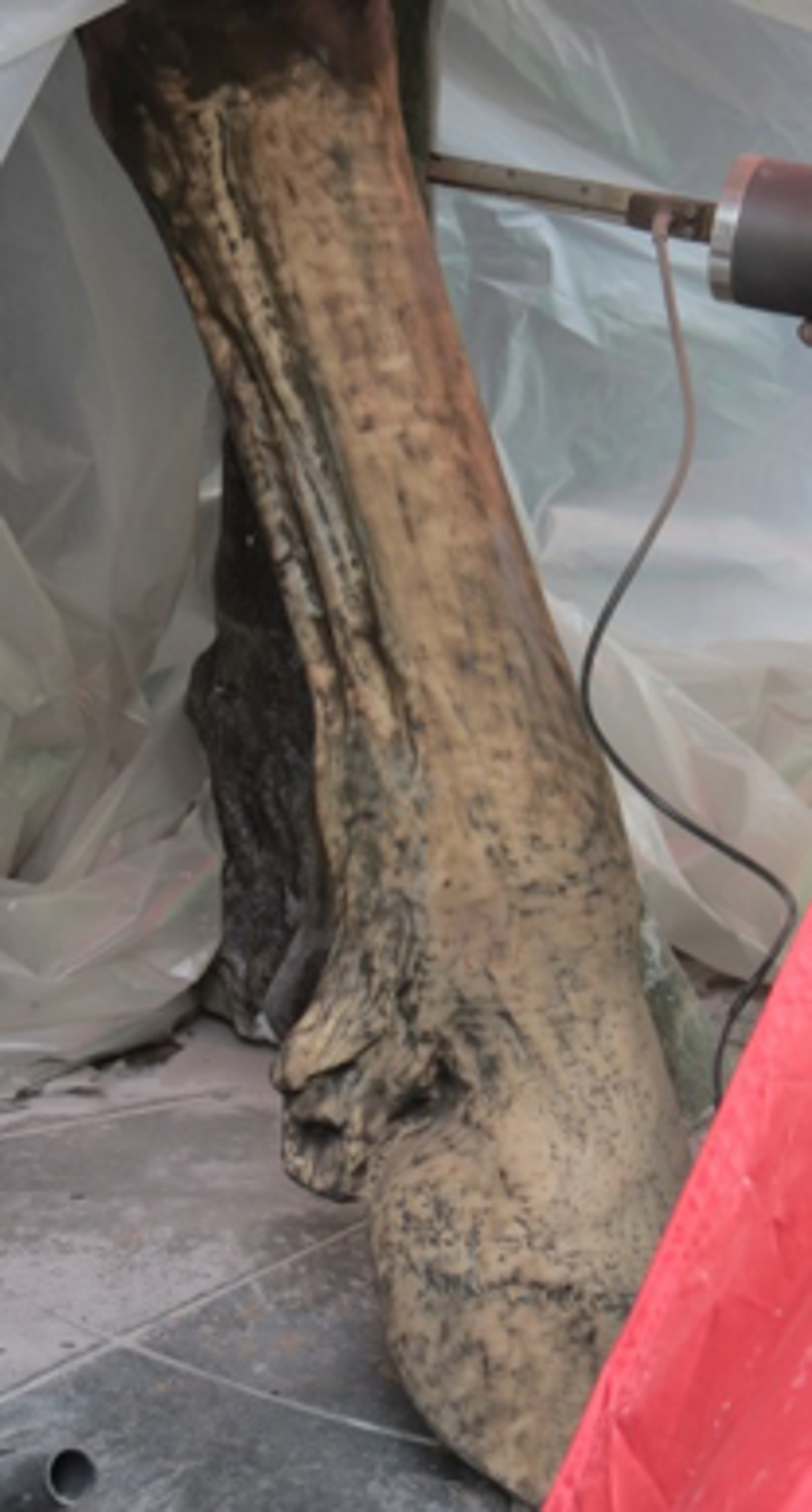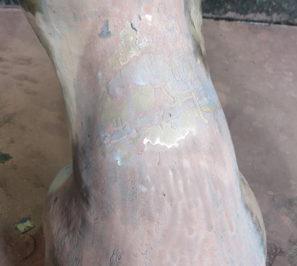In consultation with the owners we discussed with UK Bronze repairing the bronze on the hooves. We undertook between us to strip off the wax from the knee down on the six affected legs prepare the surface and add new bronze back using the DFSMD process.