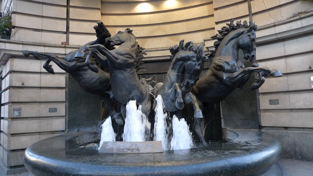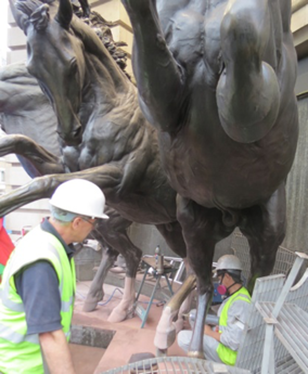 The six hooves that are in the water suffer damage and acid erosion from contaminants, generated by Tourism, in the water. UK Bronze are contracted to maintain the sculpture and the fountain. Up to now they have been cosmetically covering the damage.